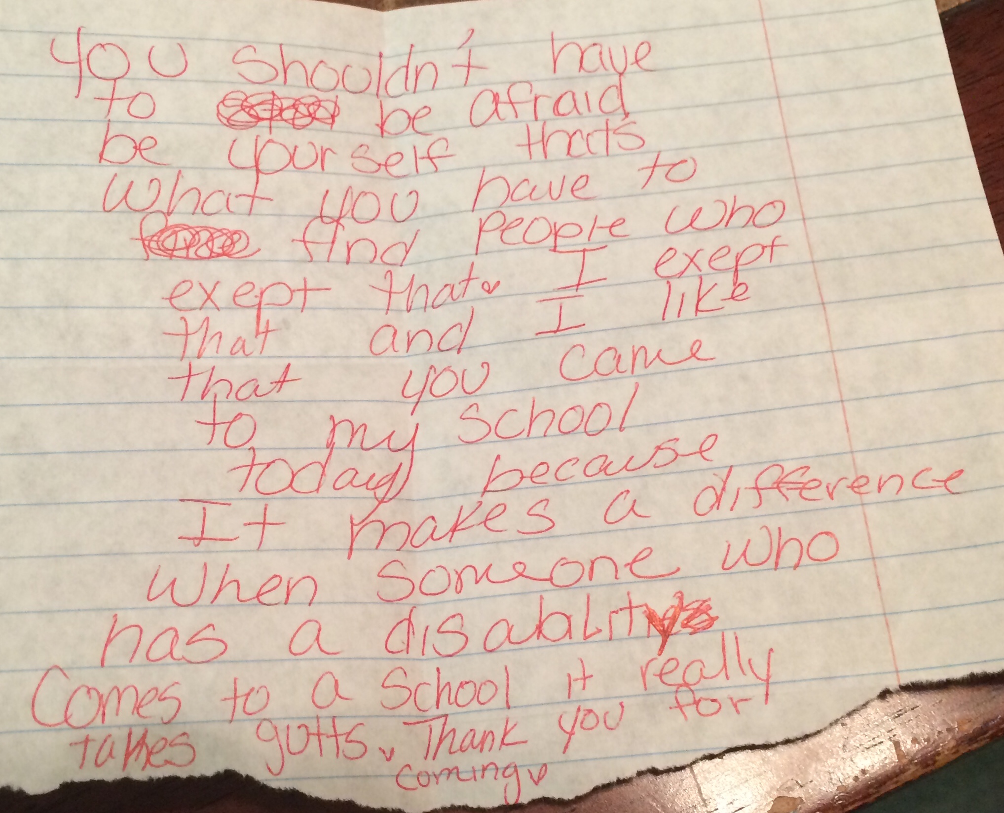 Another girl came up to me in a different class and gave me the below note. It brought tears to my eyes. I definitely believe I made the right decision to talk about stuttering that day. Any time you can go and talk to kids about stuttering, differences, tolerance and respect, do it. It makes a difference.